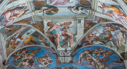 The Sistine Chapel ceiling was painted by Michelangelo (Michelangelo di Lodovico Buonarroti Simoni, I have never known his full name until just now) between 1508 and 1512. Along the central section of the ceiling, Michelangelo depicted nine scenes from the Book of Genesis, the first book of the Bible.