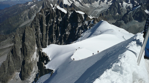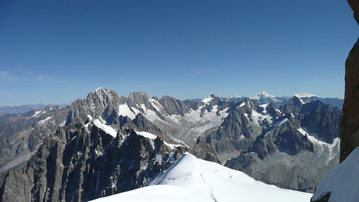 Mount Blanc is a humble-looking flat-top summit unlike some of the other more dramatic looking needle-like peaks nearby. The logo of Montblanc pens is therefore quite appropriate given the roundness of the summit. I hope you can match up the panorama with the actual view – the first peak from right to left in the panorama is Mount Blanc at 4810 m – the highest point in Europe.