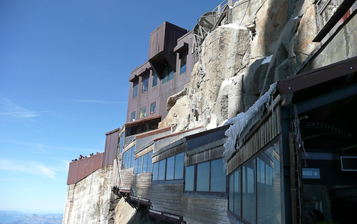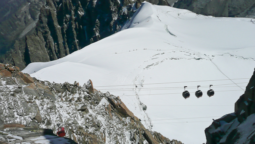 There are two stages of the telepherique – a first stage that lands at Le Plan du l’Aiguille at 2233m and a second stage goes up to the summit at 3842m (photo below).  The whole trip was about 20 minutes. Some people did not line up, and the crowd rushed for the door to get the best window position. There were backpackers who had not taken a shower for days  – it was essentially a sardine rush-hour experience in a serene alpine environment – surreal.