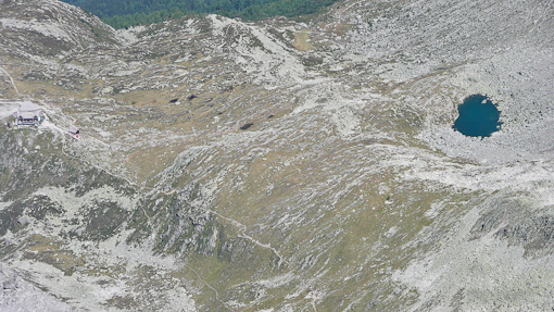 This is a view looking down towards the departure point of our hike at 2233m. Can you see at the left hand edge of the photo a tiny Plan du l’Aiguille – the first landing of the telepherique ?  I would like to go the little lake –  Lac Bleu at 2299m … may be next time. Our hike and unexpected adventure will be next !