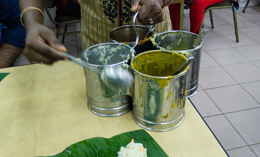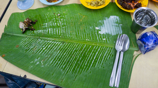As soon as we sat down, a server placed a banana leaf in front each of us and a lady following immediately behind plopped down little scoops of starters on our leaf.
