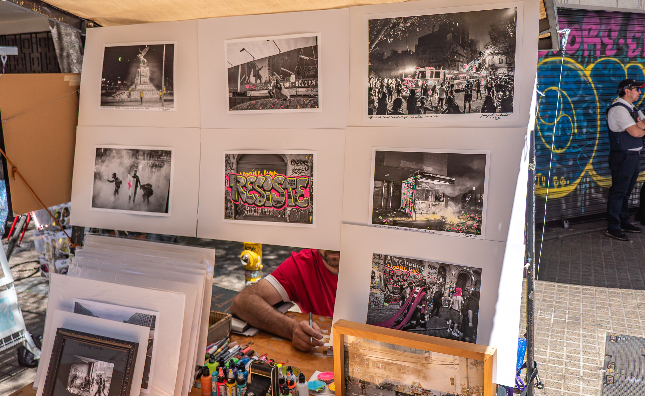 A street vendor was selling artwork which are B&W photographs tinted by fluorescent ink featuring street protests, while ironically we observed a heavy police presence to evict unlicensed vendors from the street. There were multiple motorcycles, police cars, and even a female officer ready with plastic cuff zip ties.