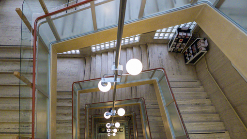 The glass wall that stretched the height of the building at 90 feet is just visible here. It lit each open-plan floor with natural light. Some of the original features are still in place such as the stairwell’s 90-foot chromium light fitting suspended from the ceiling, and the steel and glass handrails